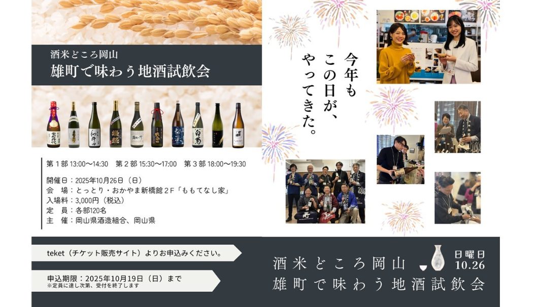 ※定員に達し次第、受付終了となります。 - 備考:本イベントの翌日の10月27日(月)には、酒類業界関係者を対象に、岡山県の10蔵が出展する無料試飲会「岡山蔵元大集結」も開催されます。詳細は「teket」をご確認ください。